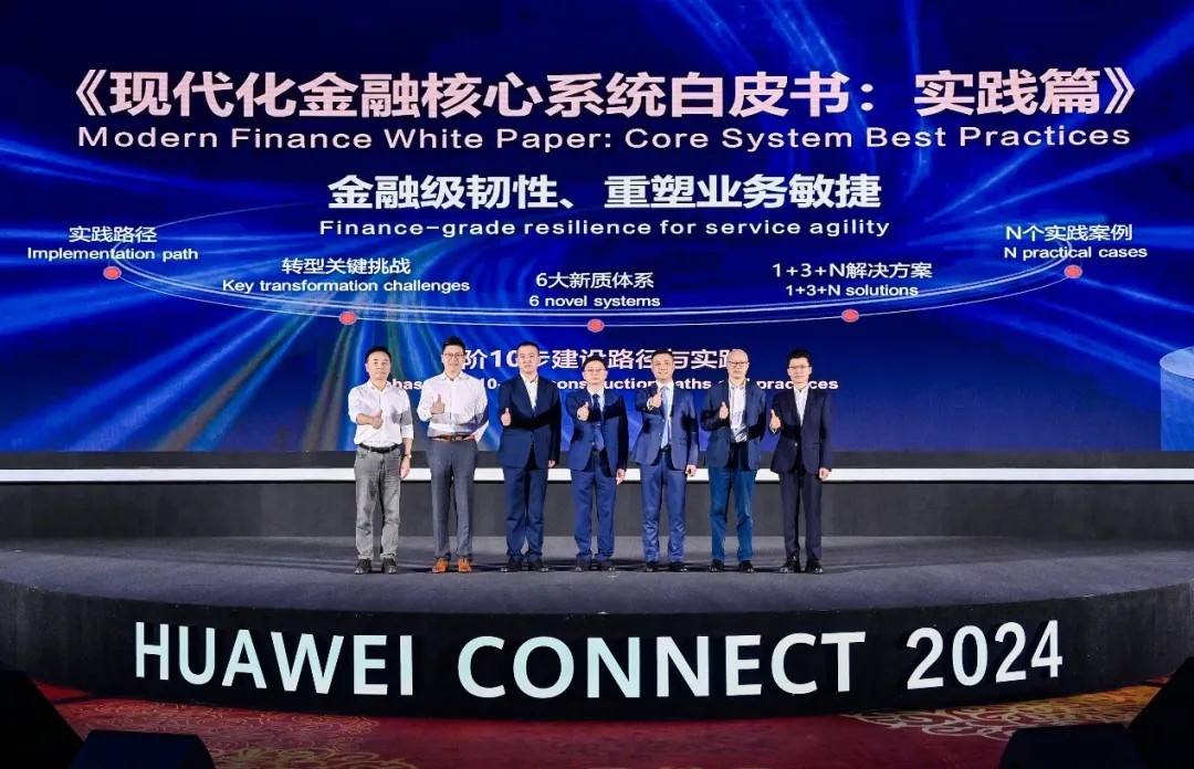 在9月20日举行的华为全球智慧金融峰会,华为与神州信息等伙伴共同发布《现代化金融核心系统白皮书:实践篇》(以下简称“白皮书2.0”)。该白皮书2.0沉淀了金融核心系统建设的最佳实践,为金融机构加速核心改造升级指明了方向。神州信息副总裁于丁,华为数字金融军团CEO曹冲,华为混合云总裁尚海峰,华为数字金融军团分布式新核心业务总经理韩满、金融信息化研究所副总经理黄程林等嘉宾参与现场发布仪式。